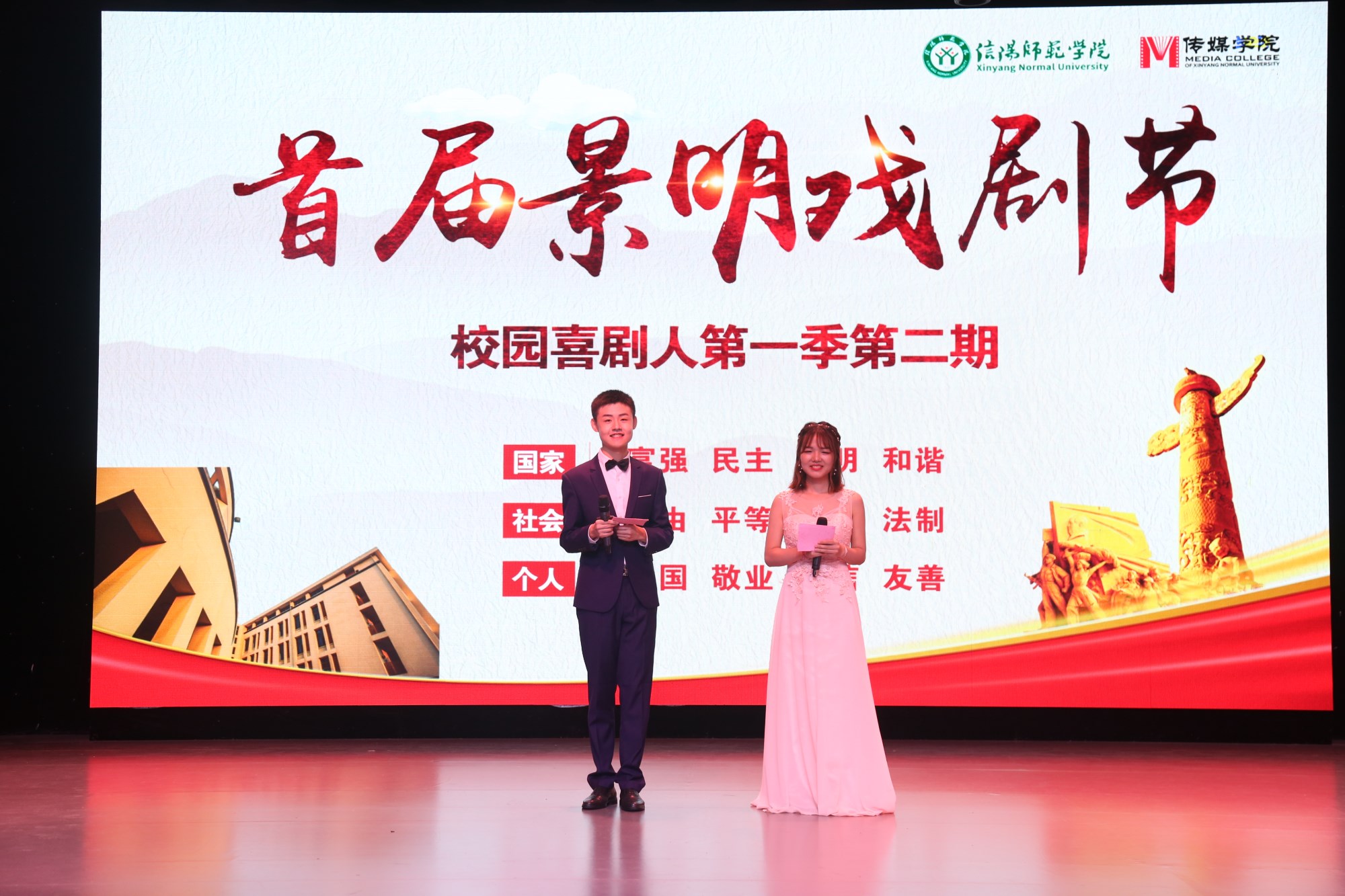6月5日晚,景明戏剧节第一季第二期在社科楼演播厅举办。院长焦素娥、党委书记王振海、副院长刘想如、党委副书记胡波同200余名师生共同观看了此次晚会。 戏剧节以校园喜剧人的形式呈现,采取班级与社团擂台赛的方式进行,围绕社会主义核心价值观进行原创话剧的创作,每期六部作品。小品《键之剑》以文明为主题,告诉大家注意网络安全;小品《选村长》以民主为主题,表现了村长选举中的种种趣事;相声《追求自由》以法治为主题,呈现了“法”与“情”的抉择。经过三轮的激烈角逐《选村长》、《我要自由》、《惊雷》三部作品入围,《追求自由》被评为最佳作品。 景明戏剧节以社会主义核心价值观为主题,以原创小品为表现形式,将社会主义核心价值观同舞台表演、专业实践相结合,突出价值引领,增强班级凝聚力,使广大师生在欣赏戏剧小品的过程中将社会主义核心价值观内化为情感认同,外化为行动自觉。(beat365中国唯一官方网站 于湾湾/供稿 魏天赐 梁志豪 杨乔木/供图 )